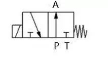 2、识别常态位。电磁阀都有两个或两个以上的工作位置,其中一个为常态位,即阀芯未受到操纵力时所处的位置。利用弹簧复位的二位阀是以靠近弹簧的方框内的通路状态为其常态位。对于三位阀,图形符号中的中位是常态位。绘制系统图时,油路/气路一般应连接在换向阀的常态位上。